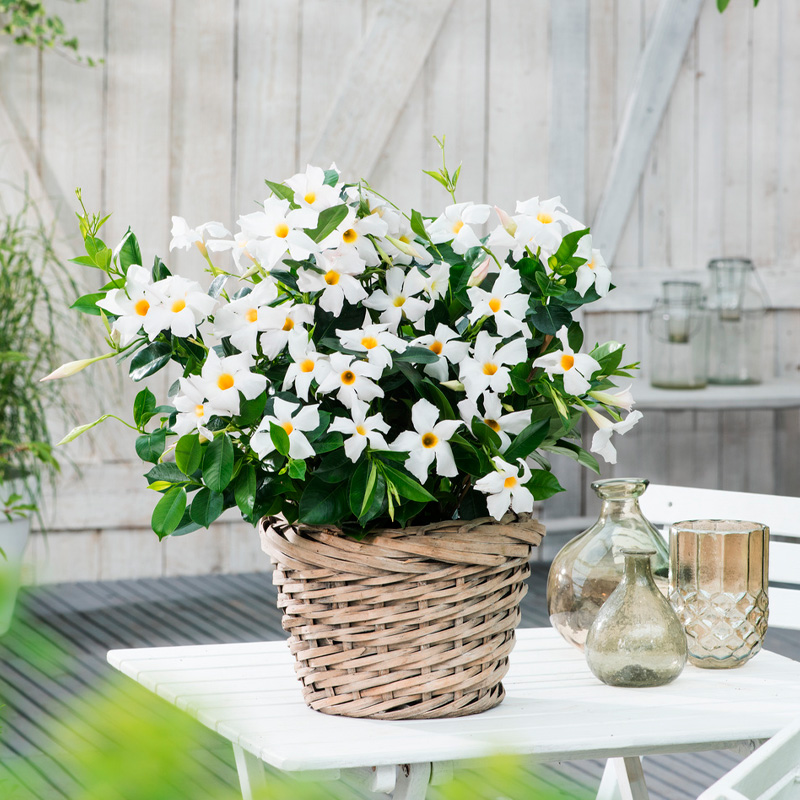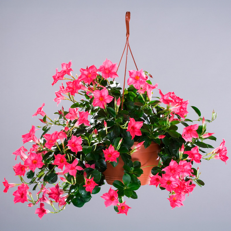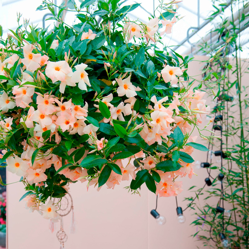 Si el suelo ya está lleno, ¡usa el aire! La Dipladenia colgante es la opción perfecta para quienes quieren color sin ocupar espacio… como las estrellas.