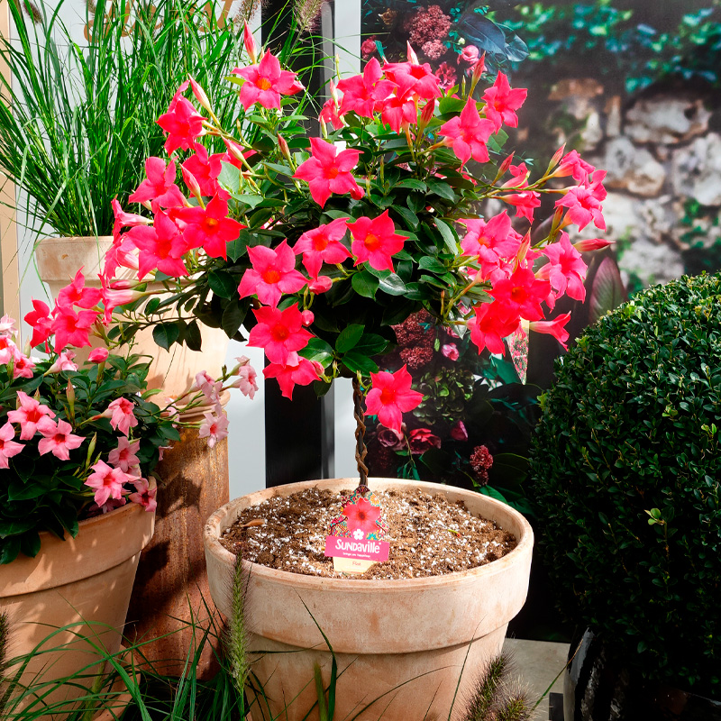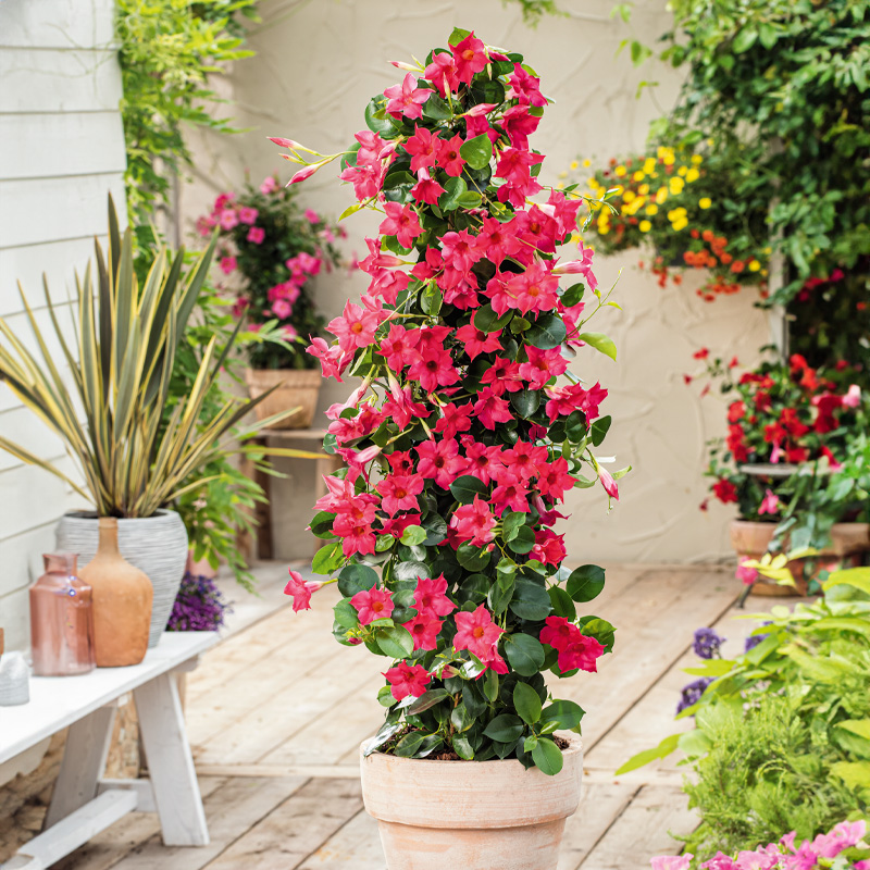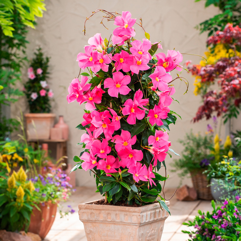 Alta, esbelta y con un porte que impone. La Dipladenia pirámide no es una planta cualquiera, es la que va directa al centro de todas las miradas.